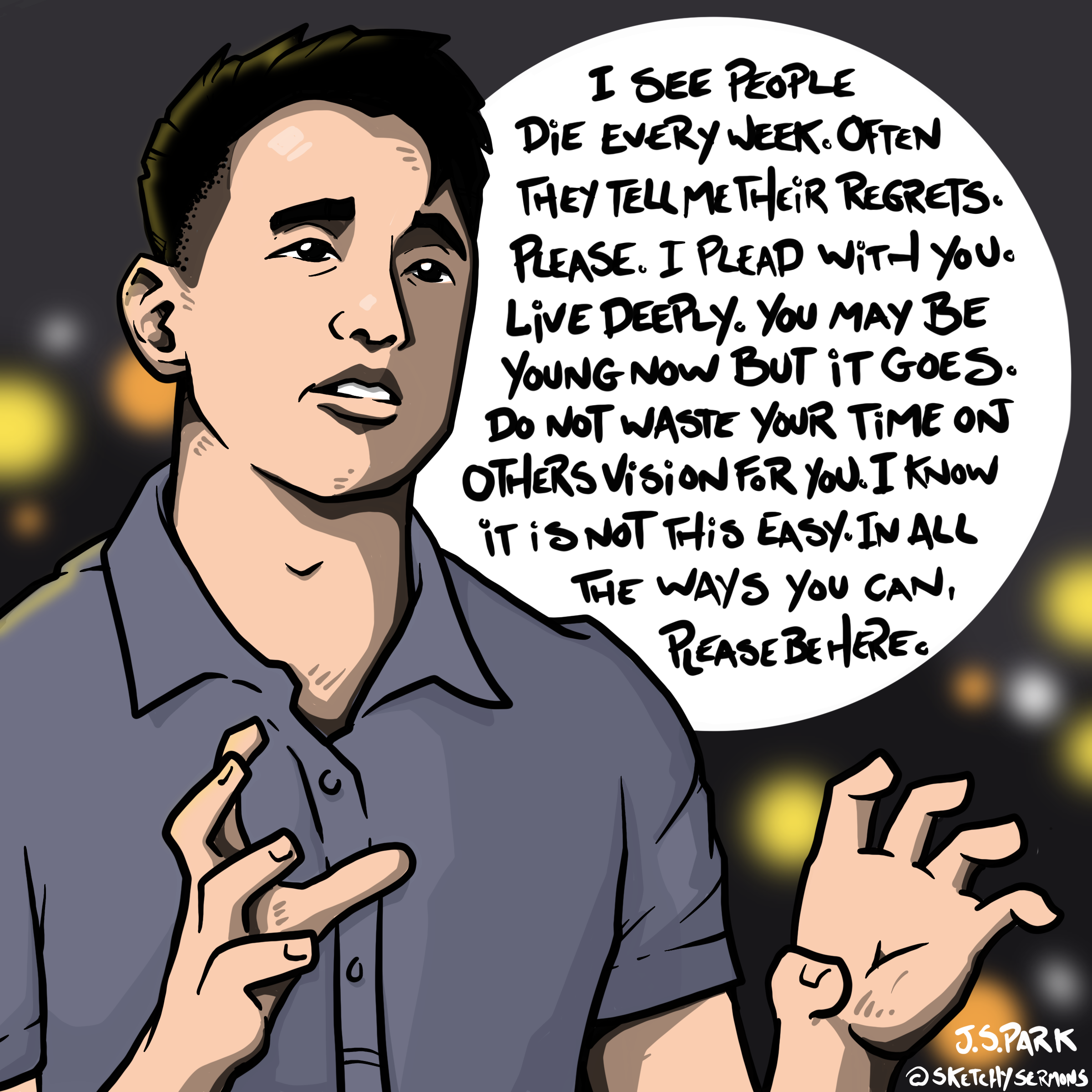 Please. I plead with you. Live deeply. You may be young now but it goes. Fast. It is a breath. Do not waste time on everyone else’s vision for you. I know it is not this easy. In all the ways you can, please be here.”